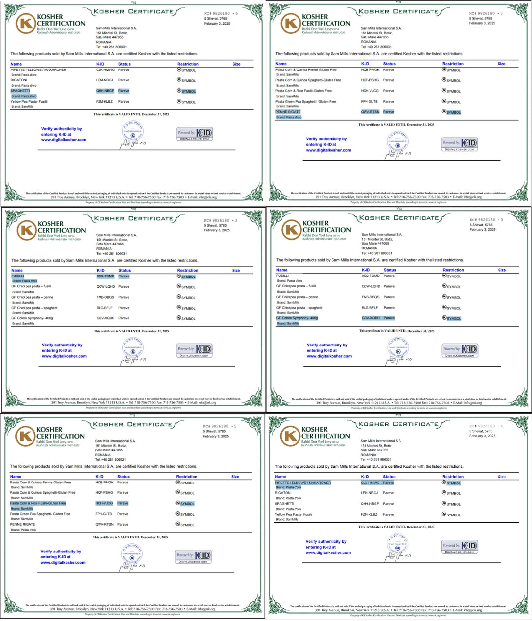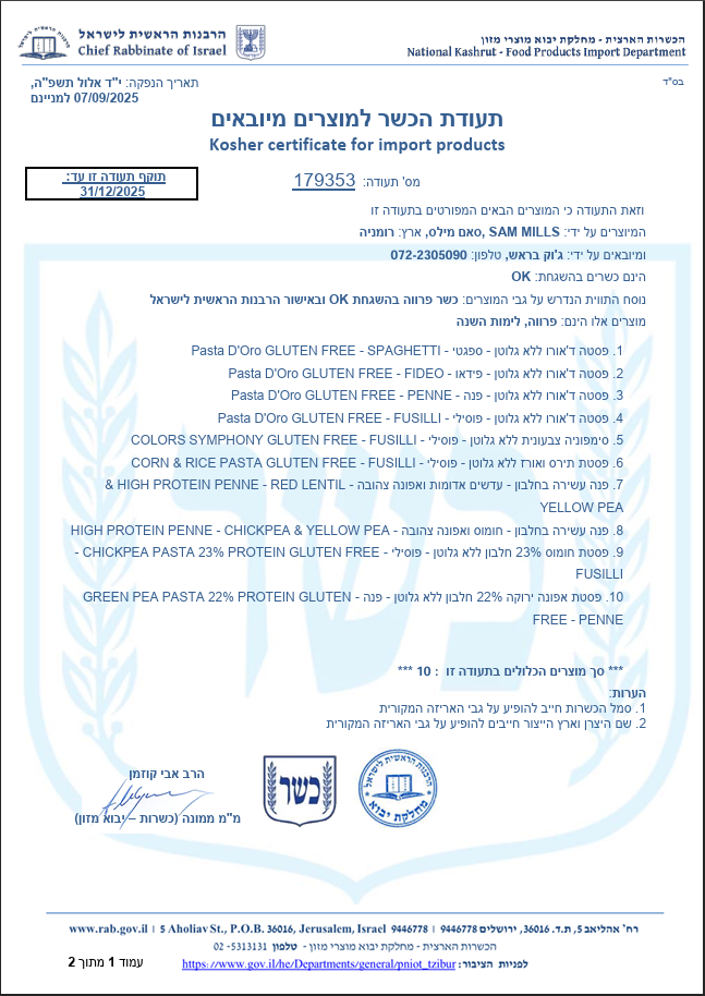 כל חמשת המוצרים בסדרת Pasta D'Oro (ספגטי, פוסילי, פנה, אלבו ואיטריות) עשויים מ-100% קמח תירס איכותי (Non-GMO). שימוש ברכיב יחיד זה מבטיח טעם נייטרלי, מרקם יציב ובטחון מלא מול רגישויות.
